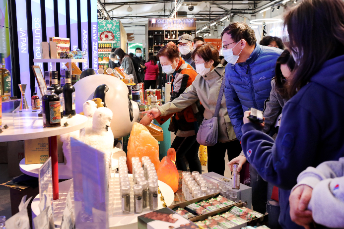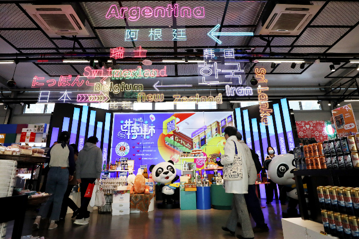 顾客走过进博集市内一处各国商品集中展示台前选购。