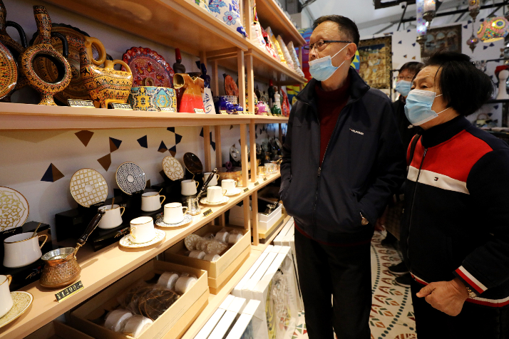 顾客在进博集市内的土耳其手工艺品展架前驻足观看。