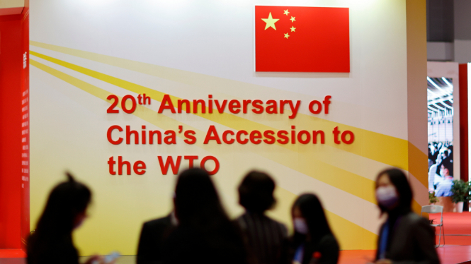 参观者在中国国家会展中心(上海)参观中国加入世界贸易组织二十周年专题展。(图片来源:中新社)