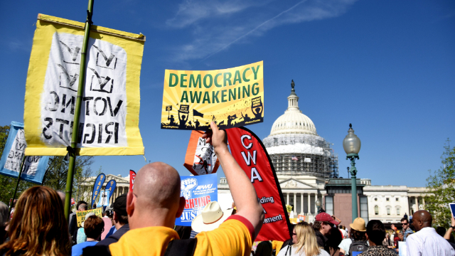 2016年4月,上千名美国民众聚集在华盛顿国会大厦外,他们高喊“不要金钱政治”等口号,表达对美国当前选举政治及民主现状的不满。(图片来源:中新社)