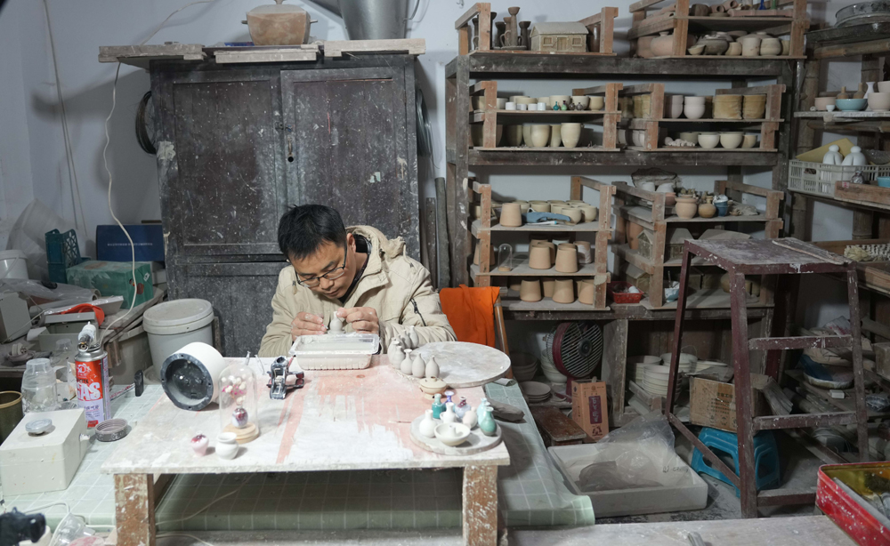 12月15日,王文化在制作微型陶瓷作品。