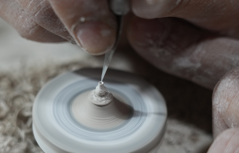 来自安徽阜阳的王文化来景德镇已有十多年时间。“大家都关注世界最大的瓷器,但世界最小的瓷器在哪却没人知道。”发现这个市场方向后,王文化开始钻研微型陶瓷。从指甲盖大的罐子到米粒大的花瓶,从发丝般纤细的修坯针到手掌大的微型拉坯机,王文化不仅做出了微型陶瓷,还制作了一批专为微型陶瓷设计的工具,“微陶老王”的名声也越来越响。