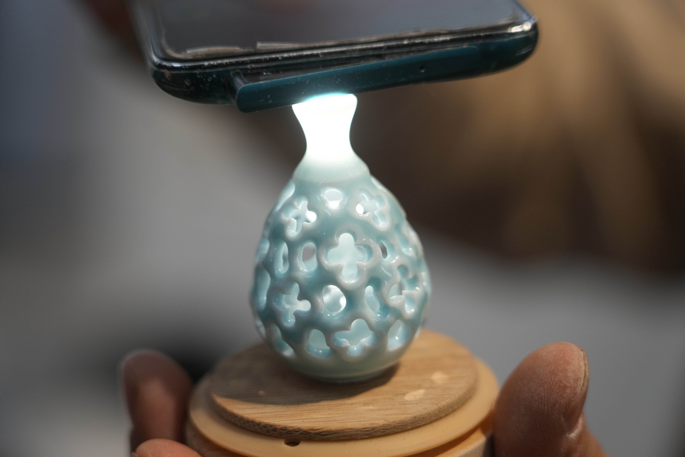 12月14日,王文化借助灯光展示一个微型陶瓷镂空花瓶。