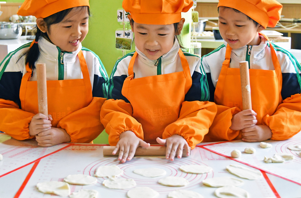 12月20日,山东省烟台市福山区实验幼儿园的小朋友学擀饺子皮。