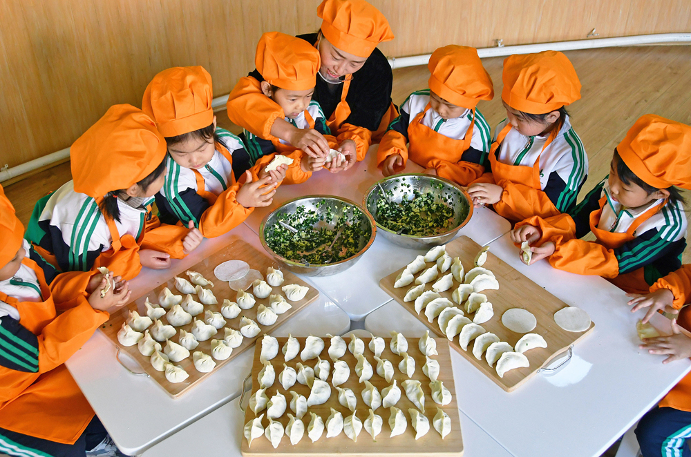 12月20日,山东省烟台市福山区实验幼儿园的小朋友学包饺子。