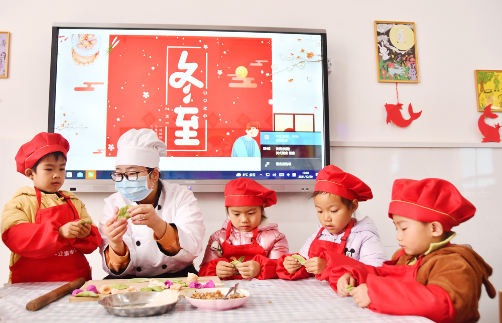 12月20日,湖南省永州市江永县工业集中区幼儿园老师和孩子们一起包饺子。