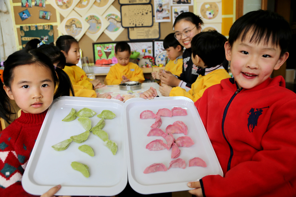 12月20日,在江苏连云港核电钟声国际幼儿园,小朋友展示包好的彩色饺子。