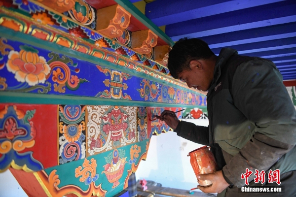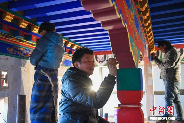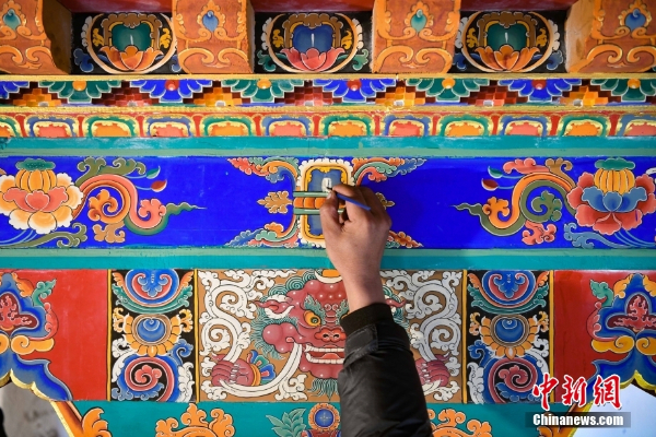古俗民族传统手工艺发展专业合作社员工在房屋上绘制藏式装饰。