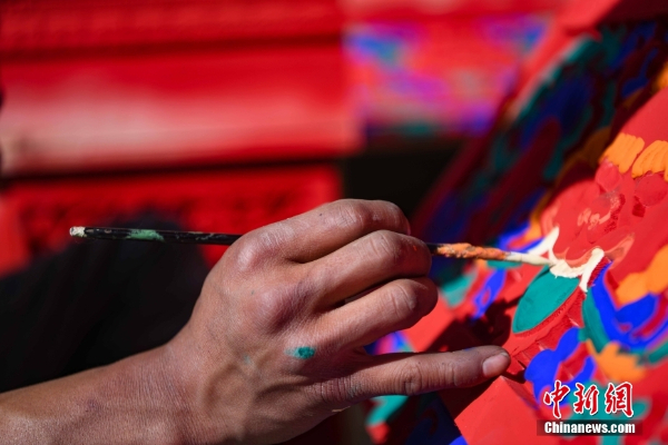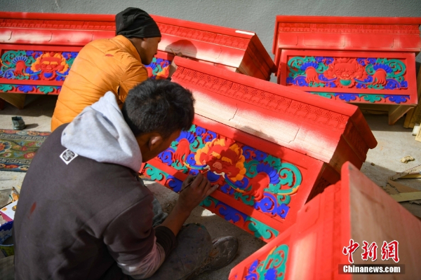 古俗民族传统手工艺发展专业合作社员工在家具上绘制藏式装饰。