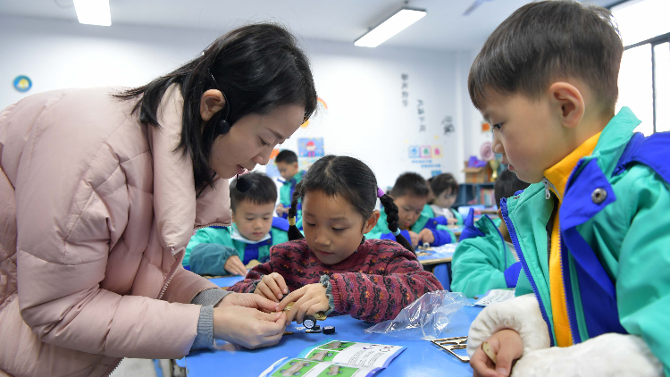 在江西省南昌市珠市学校教育集团云飞路校区,辅导老师指导航模兴趣小组的学生组装航模。(图片来源:新华社)