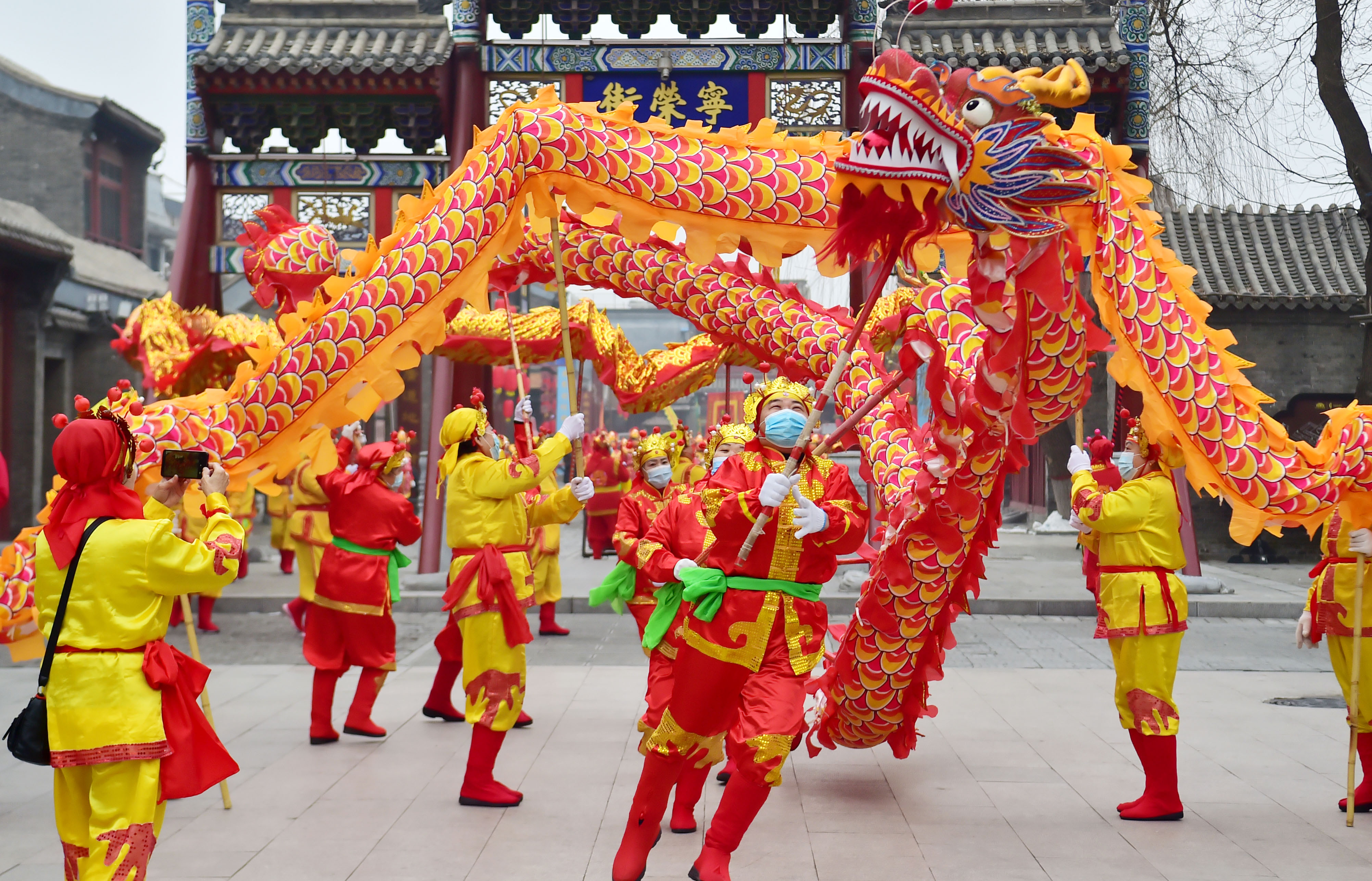 1月27日,在河北省正定古城荣国府景区宁荣街,民间艺人进行舞龙表演。