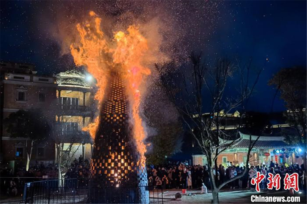 在晋江梧林传统村落,燃烧的“烧塔仔”寓意着新年平安、兴旺。(图片来源:中新网)