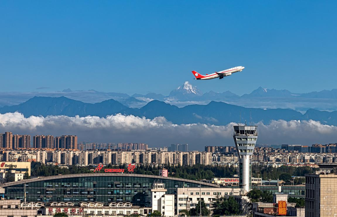 ↑一架航班从双流国际机场起飞,远处可遥望到雪山。