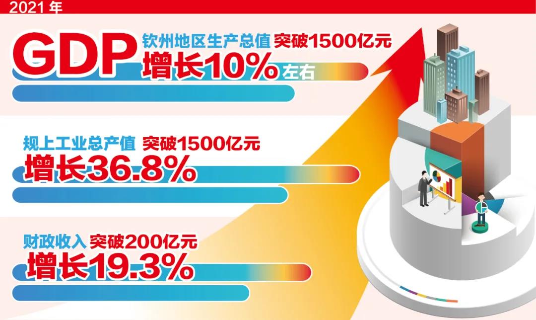 时来天地皆同力。百年前,孙中山先生在其《建国方略》中将钦州列为“中国大西南最便捷最省俭的海上贸易积载地”。天然深水良港钦州港可建万吨以上泊位200多个,可形成5亿吨以上吞吐能力。从上世纪90年代开始,凭借着独特的资源优势和自强不息的“钦州精神”,历经30多年的不懈奋斗,勇于进取的钦州人搭建起广西自贸试验区钦州港片区、中国-马来西亚钦州产业园区、广西钦州保税港区、钦州港经济技术开发区、国际陆海贸易新通道重要节点等一大批国家级平台,推动钦州走到了开放开发的最前沿。2022年,世纪工程项目平陆运河将开工建设,这个列入国家规划的工程建成后将推动北部湾形成“海铁+江海”联运新格局。如今,钦州港进入全球集装箱港口百强榜单、排名第47位,集装箱吞吐量排名位列中国沿海主要港口第12位。2021年,钦州地区生产总值突破1500亿元,增长10%左右;规上工业总产值突破1500亿元,增长36.8%;财政收入突破200亿元,增长19.3%,成为广西第5个财政收入超两百亿元的城市;口岸进出口总值突破1000亿元、达到1200亿元,成为广西第三个进出口总值超千亿元的城市。