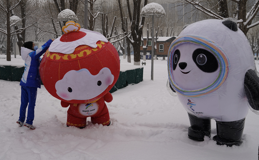 2月13日,北京迎来降雪。在北京冬奥会主媒体中心附近,未在工作时段的志愿者为雪中的“雪容融”整理“衣服”。(图片来源:中新社)