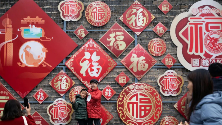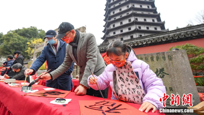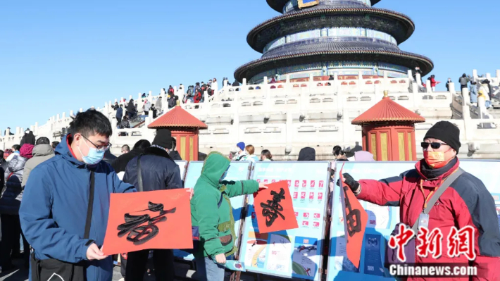 2022年2月1日,农历大年初一,北京市民在天坛公园晒“福”字。(图片来源:中新社)