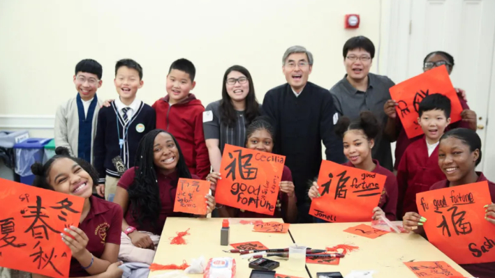 2018年2月,美国纽约,来自北京和纽约的小学生展示他们写的“福”字。(图片来源:中新社)