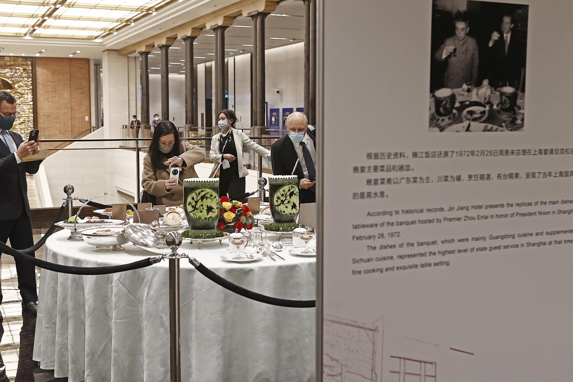 图为嘉宾用手机拍摄当年周恩来总理与尼克松总统晚宴的主要菜品和器皿。