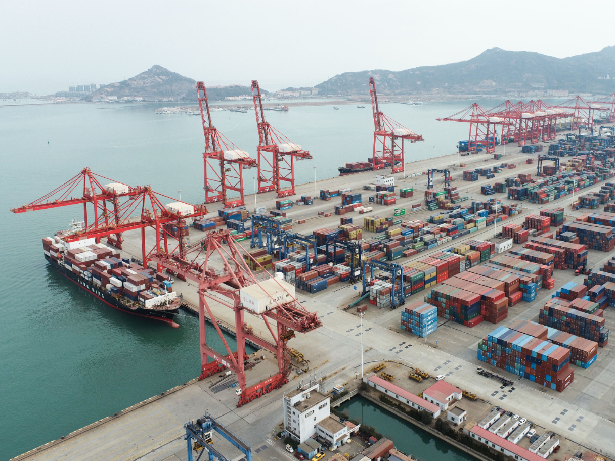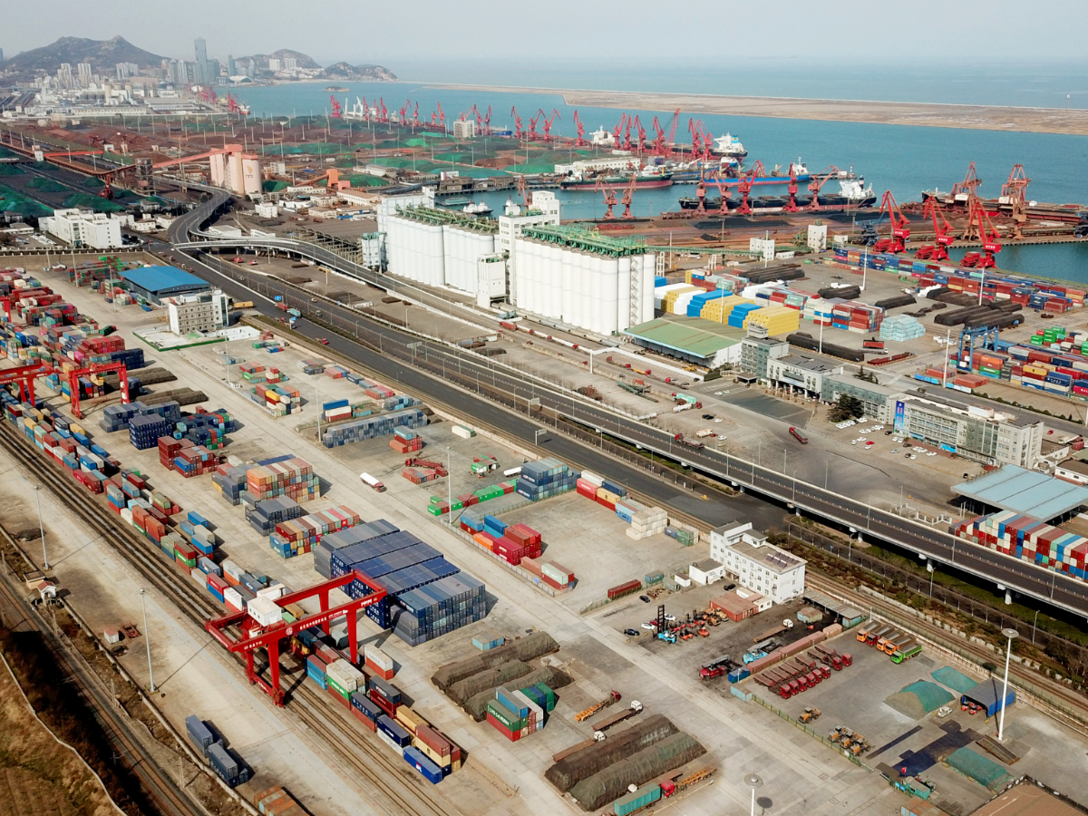 图为3月7日拍摄的江苏连云港港口码头等待作业的大批集装箱。(图片来源:本文图片均自新华社)