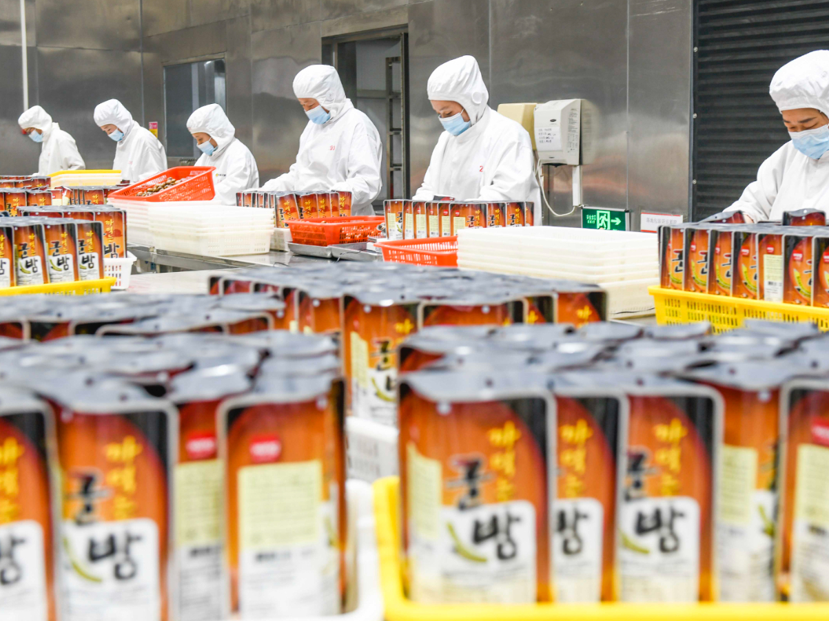 3月7日,工人在河北省遵化市苏家洼镇一家栗子加工企业车间包装出口栗子。