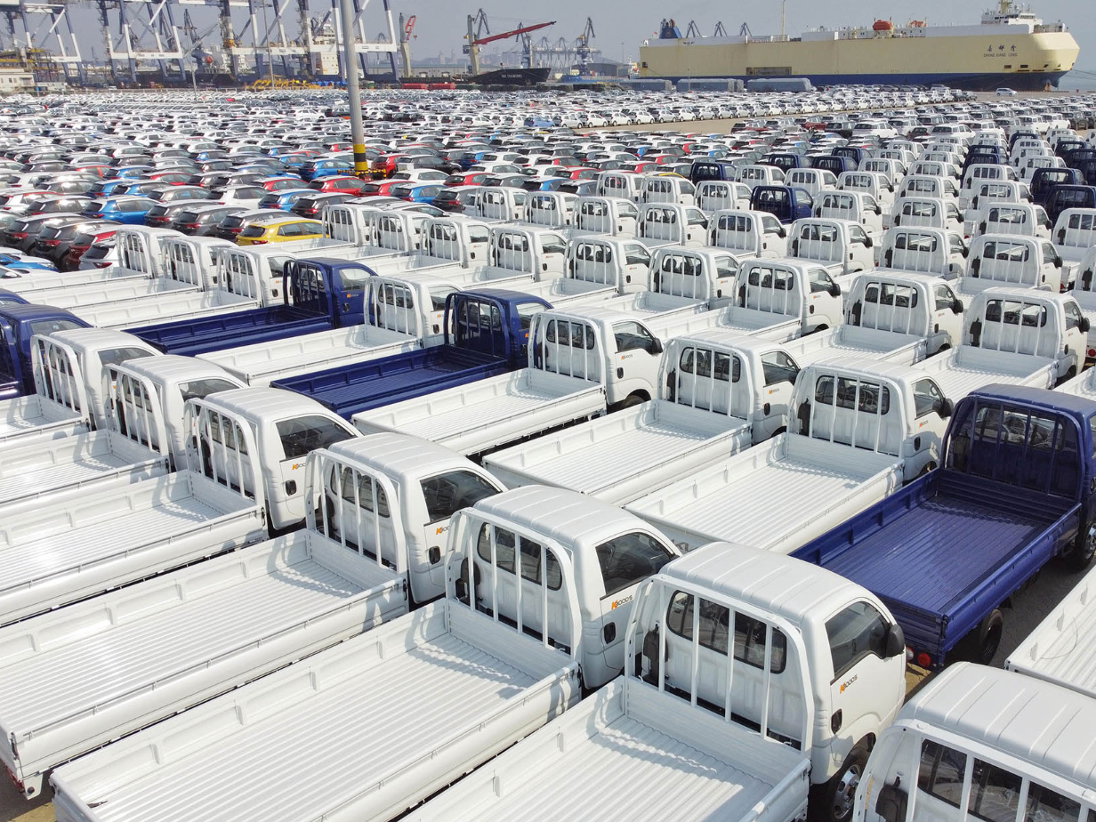 3月7日,大批出口商品车在山东港口烟台港集结等待装船。