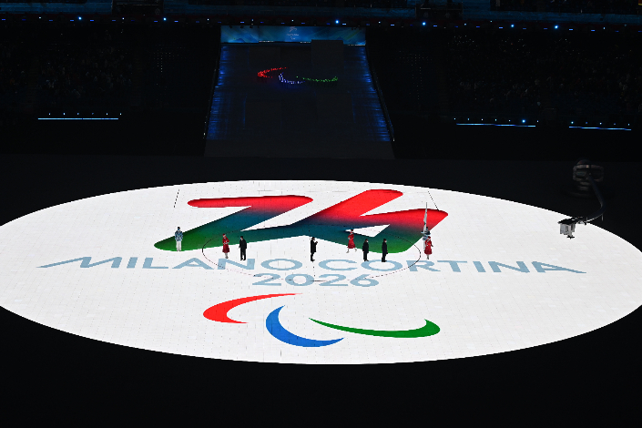 代表团旗帜入场环节,冬残奥会引导员手持各参赛代表团引导牌。