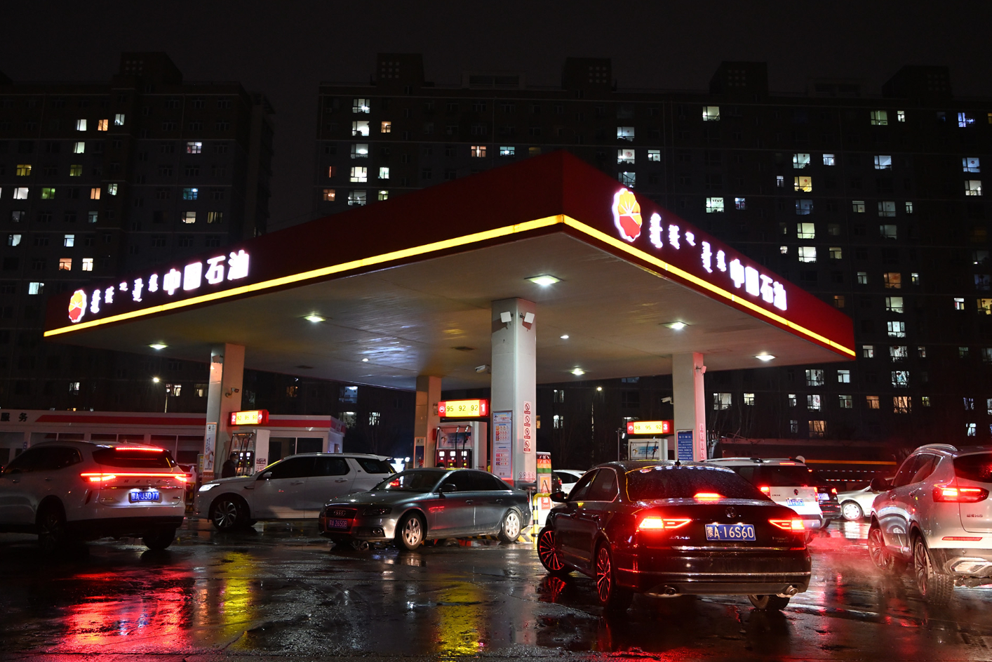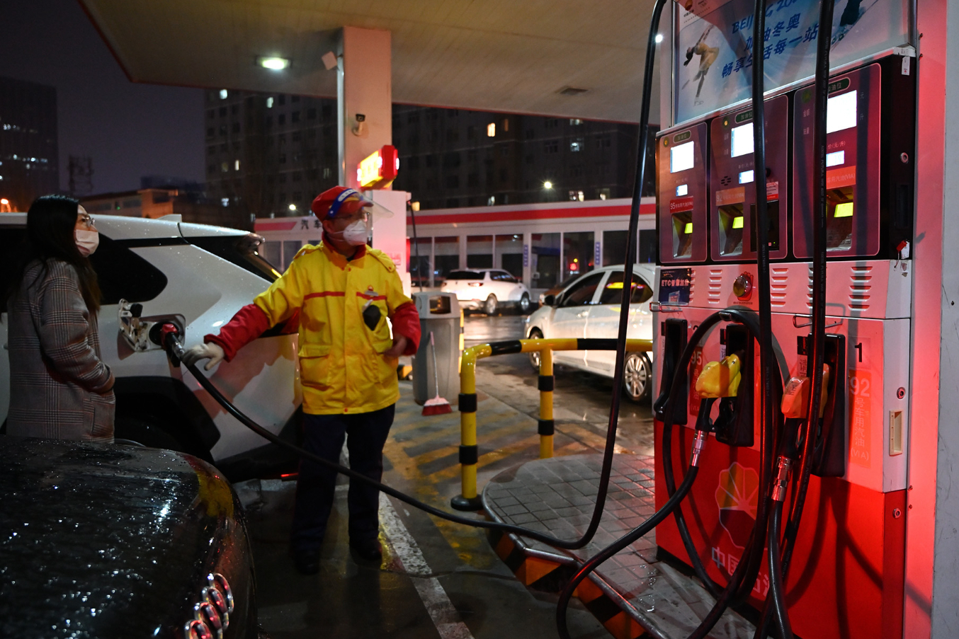 3月17日晚,呼和浩特市一加油站内,工作人员给车辆加油。