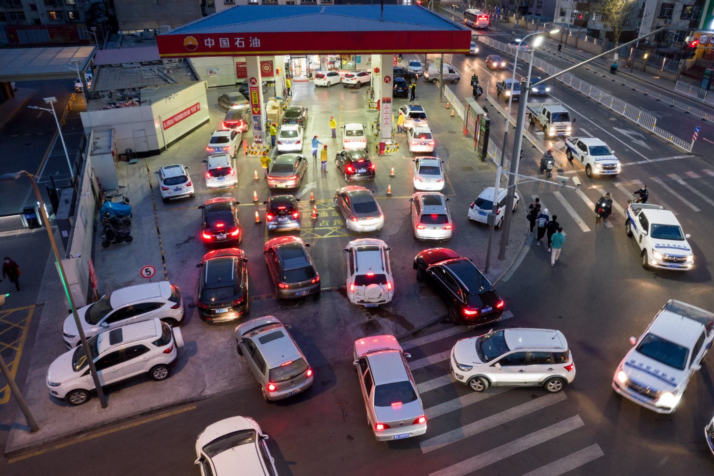 3月17日,在山西省太原市,民众驾车在加油站外排队等待加油。