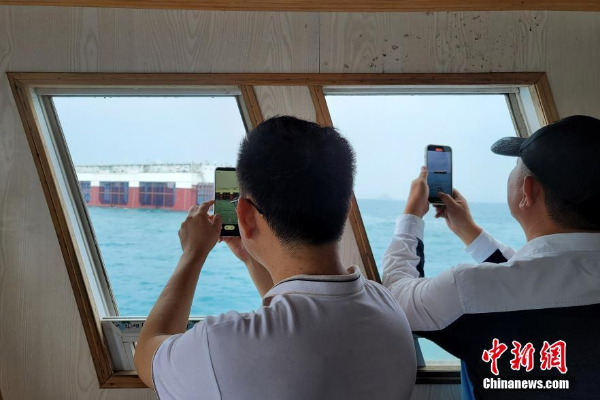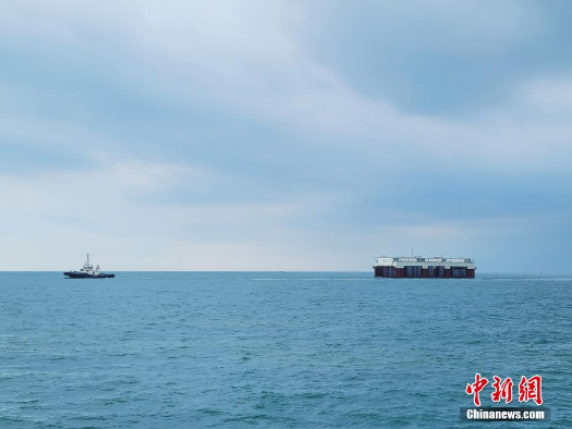在拖移过程中,引导船上的人们通过舷窗拍摄平台。(图片来源:中新网)