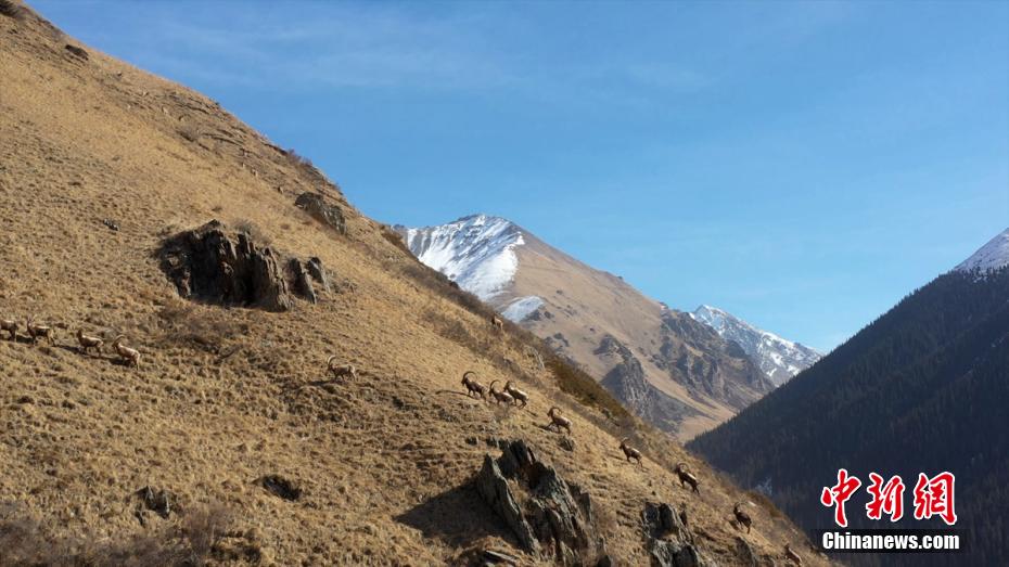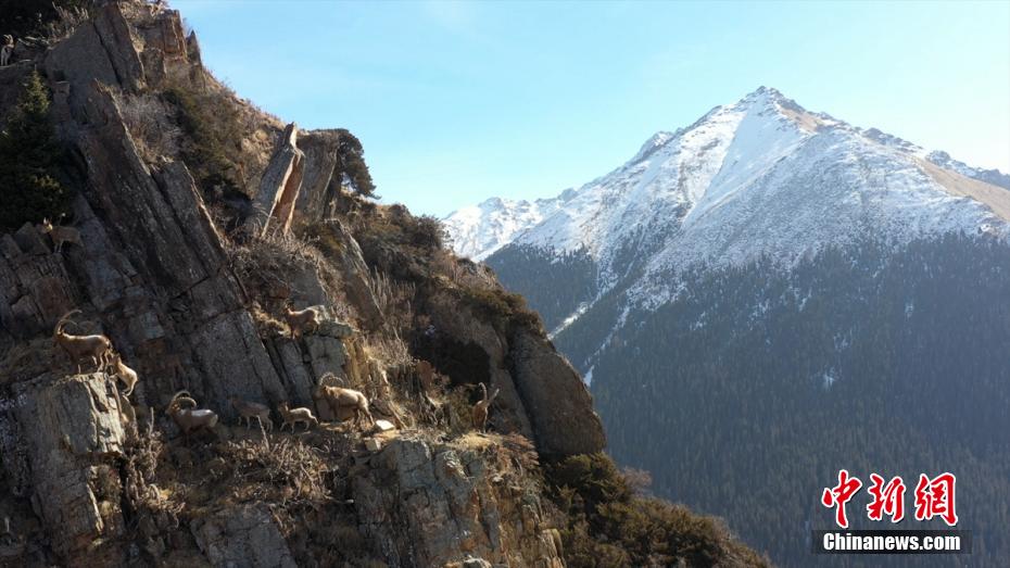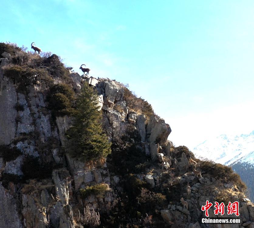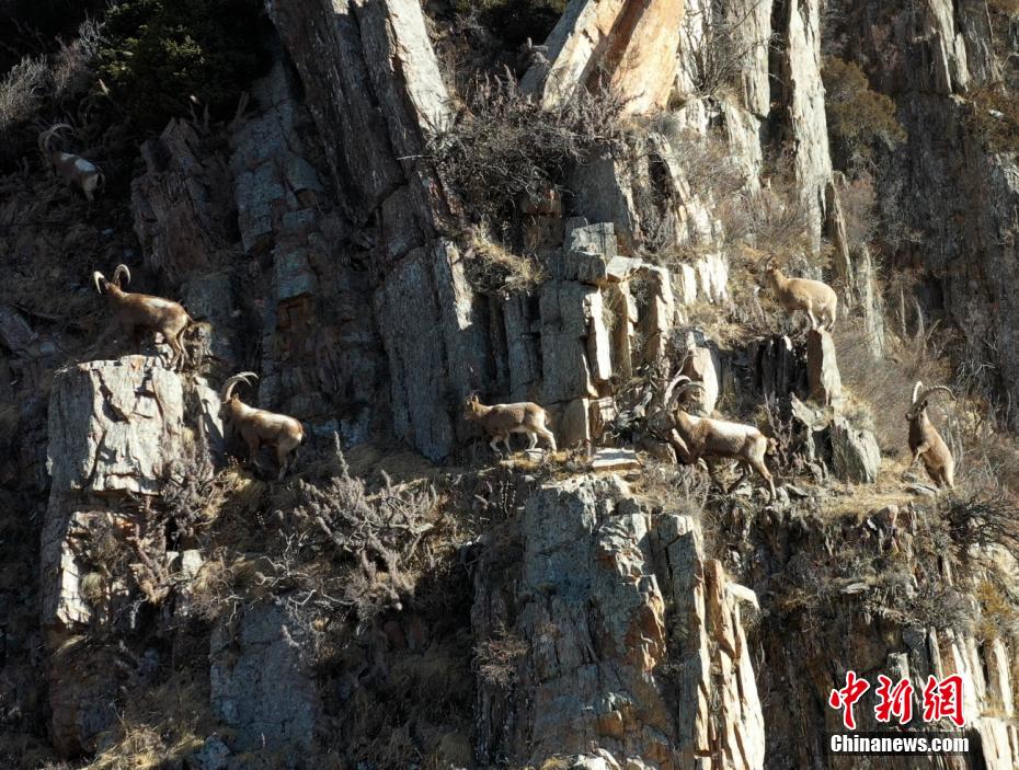 野生北山羊沿着陡峭的山壁攀爬。(图片来源:本文图片均自中新网)