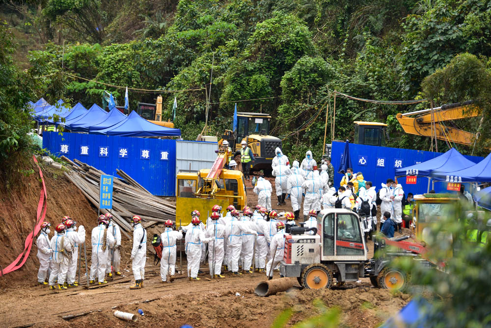 3月27日,在广西梧州藤县东航MU5735航班坠机救援现场,救援人员列队准备进入核心区。(图片来源:中新社)