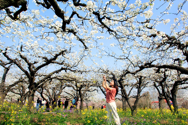 4月3日,游客在安徽省淮北市烈山区宋疃镇和村千亩梨园赏花踏青。(图片来源:新华社)