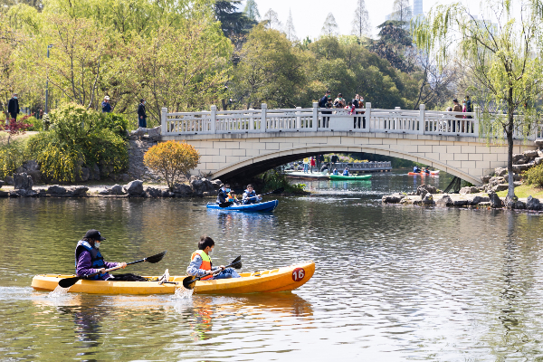 4月3日,市民在南京玄武湖公园划船游玩。(图片来源:新华社)