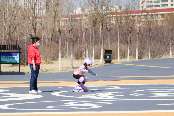 4月3日,一名小朋友在呼和浩特市草原丝绸之路文化公园滑轮滑。(图片来源:新华社)