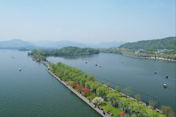 4月3日,游客在杭州西湖游览。(图片来源:新华社)