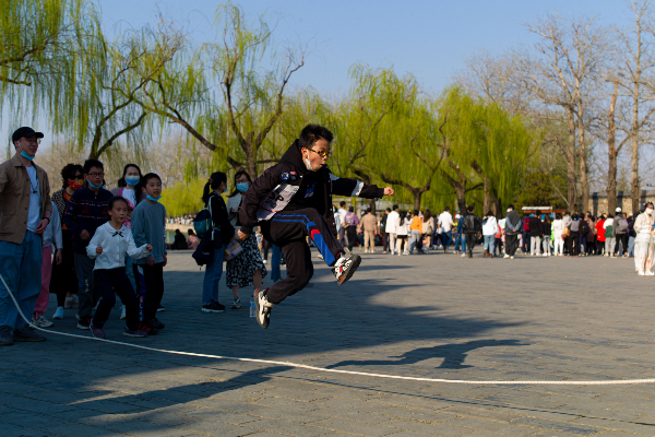 4月3日,小朋友在北京颐和园跳绳。(图片来源:新华社)