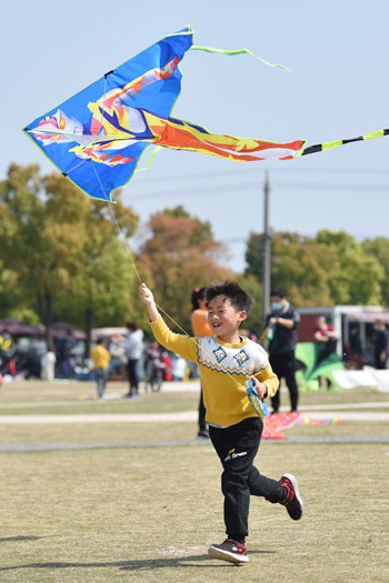 4月3日,一名小朋友在南京鱼嘴湿地公园放风筝。(图片来源:新华社)