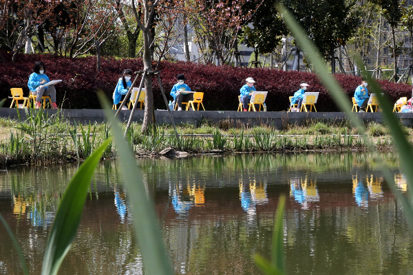 4月3日,孩子们在江苏省苏州市运河体育公园绘画。(图片来源:新华社)