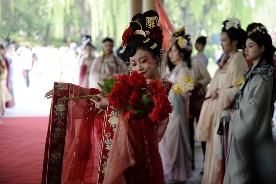 当日,被称作“百花生日”的花朝节(因疫情延期举办)也在西安多地举行。作为花朝节的常客,汉服爱好者常鏸文扮作“石榴花神”参与其中,“我和朋友们越来越乐于庆祝传统节日,除了可以展示汉服之美外,这些节日所带来的仪式感也无法替代。”