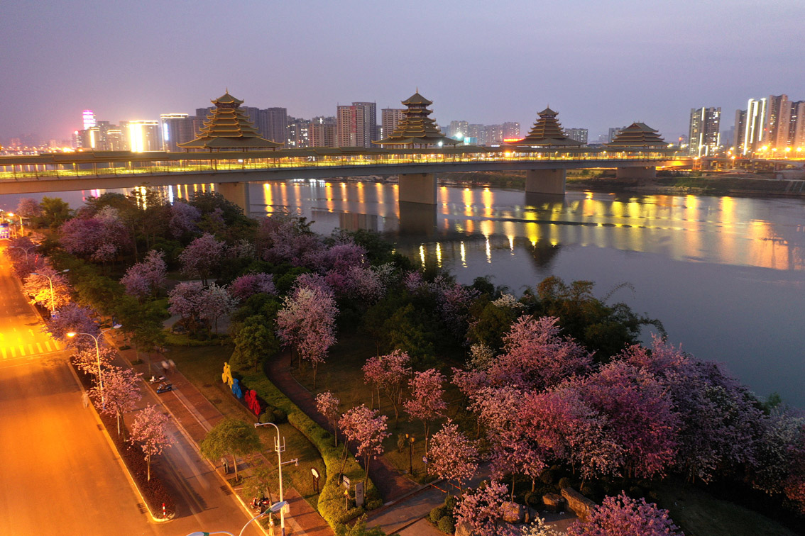 4月10日,在广西柳州市沿江路,夜幕下盛开的洋紫荆与城市景观相映。(图片来源:新华社)