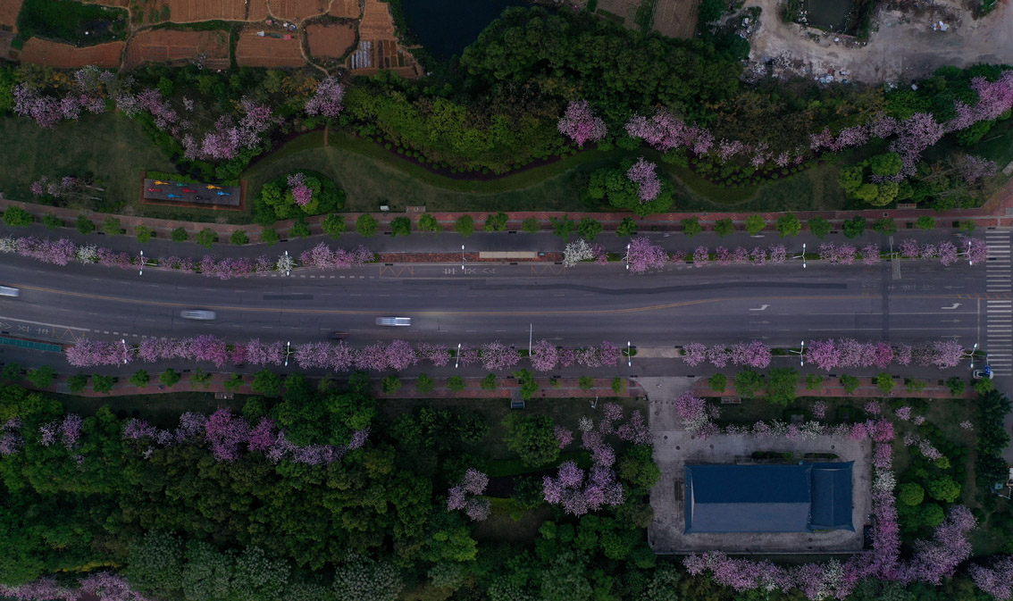 日前,广西柳州市洋紫荆竞相绽放,市区变成花的海洋。(图片来源:新华社)