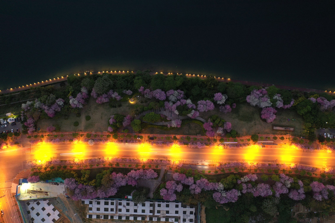 在广西柳州市沿江路,夜幕下盛开的洋紫荆与城市景观相映,格外美丽(无人机照片,4月10日摄)。(图片来源:新华社)