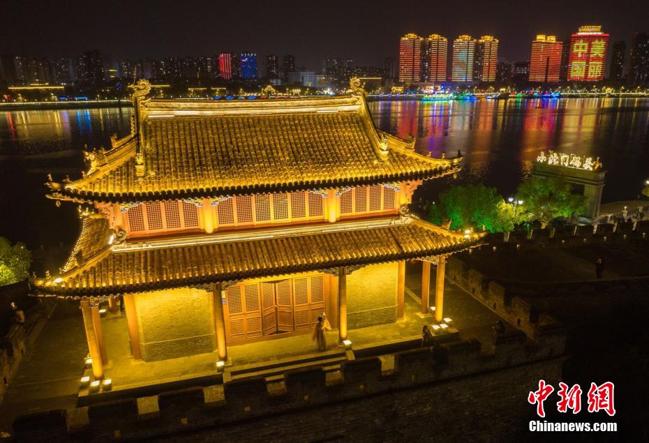 夜幕降临,华灯初上。湖北省襄阳市汉江两岸夜色和灯光交相辉映,襄阳古城古色古香,分外美丽。(图片来源:中新网)