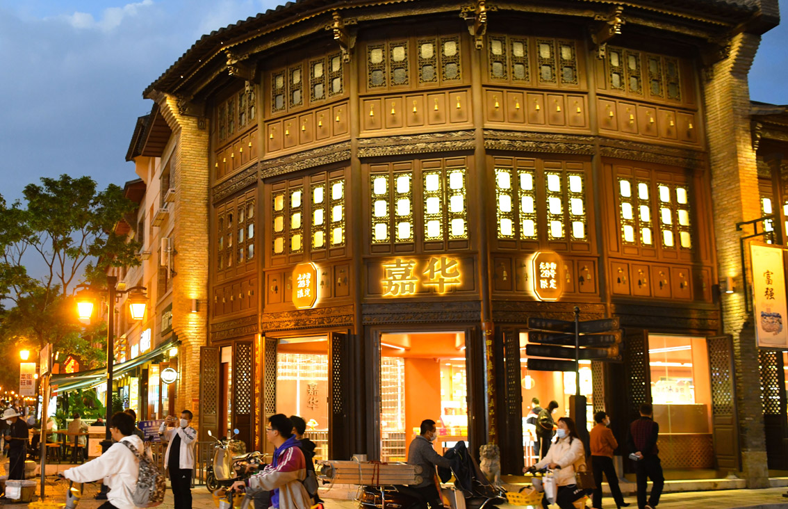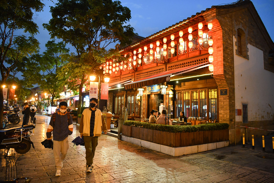 4月9日,华灯初上时的昆明老街吸引市民和游客。(图片来源:中新社)