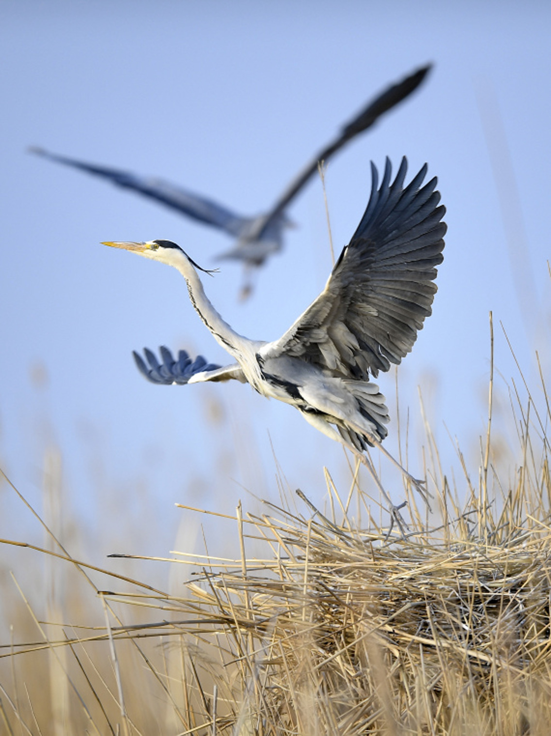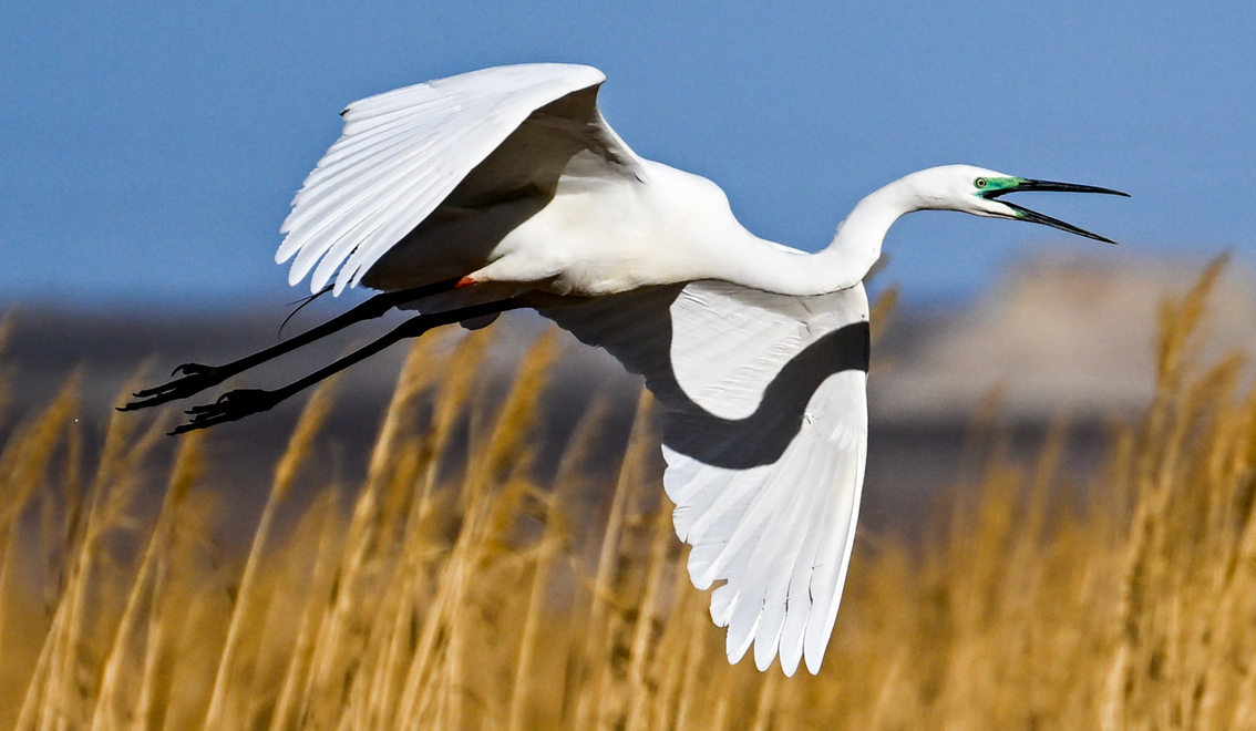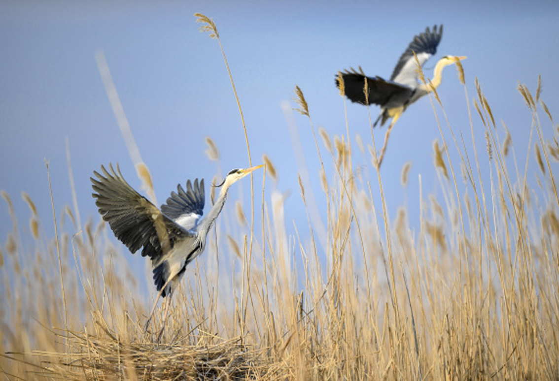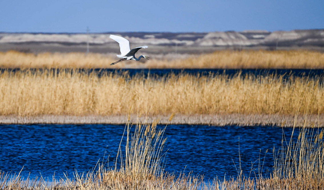 苍鹭在沙湖景区芦苇丛上空飞翔。在位于宁夏石嘴山市平罗县境内的沙湖景区,每年3月到10月,都会有大量候鸟到此繁衍、栖息。目前,沙湖水域发现的鸟类共有198种。(图片来源:新华社)