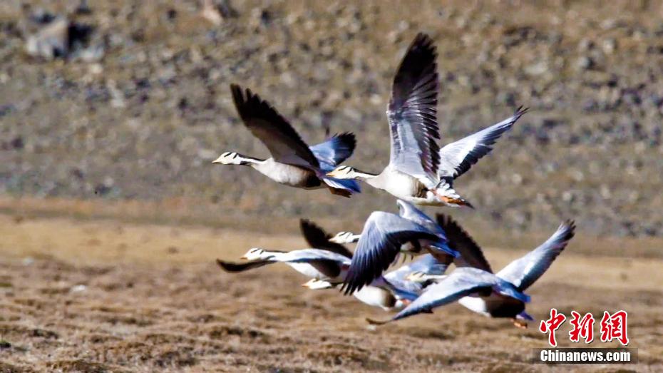 近日,“高原蓝宝石”青海湖迎来大批候鸟安营筑巢。图为飞翔的斑头雁。 (图片来源:中新网)