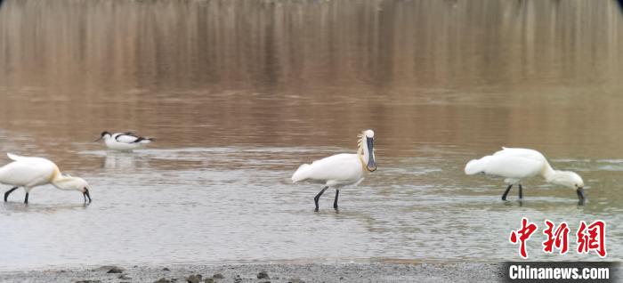连日来,在享有“京津冀最美湿地”之称的河北省衡水湖畔,成群的鸟儿在此嬉戏觅食。图为衡水湖畔的白琵鹭。(图片来源:中新网)