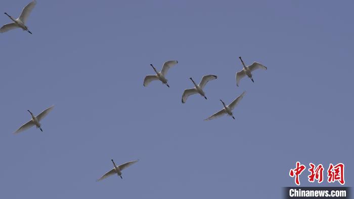 其中,濒危珍稀鸟类、国家二级保护动物白琵鹭,三两成群或停留,或嬉戏,或觅食,或低空飞翔,引人驻足。图为低空自由飞翔的白琵鹭。(图片来源:中新网)