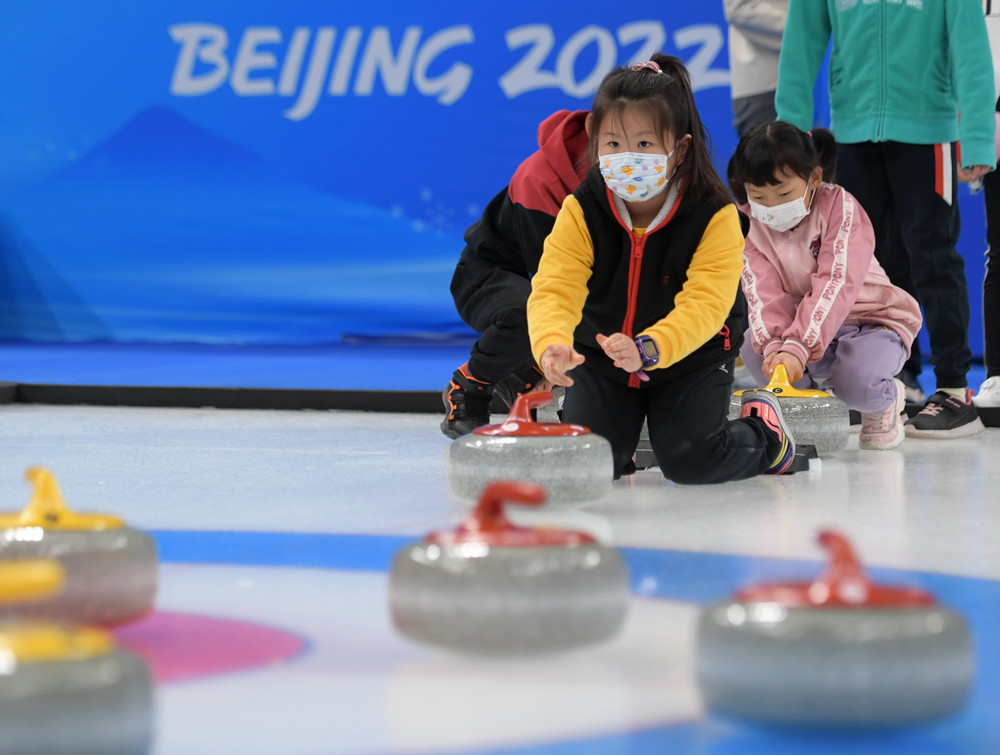 4月16日,小朋友在“冰立方”内体验冰壶运动。(图片来源:新华社)