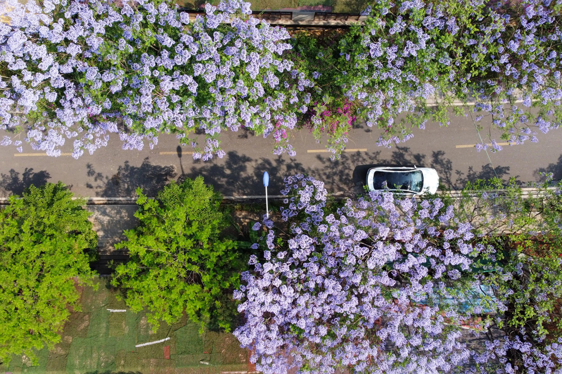 这是4月15日在四川省攀枝花市西佛山上拍摄的蓝花楹(无人机照片)。(图片来源:新华社)